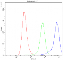 Flow Cytometry: A549 cells were blocked with 10% normal goat serum and then stained with ARG59111 anti-ATX2 antibody (blue) at 1 µg/10^6 cells for 30 min at 20°C, followed by DyLight®488 labelled secondary antibody. Isotype control antibody (green) was Rabbit IgG (1 µg/10^6 cells) used under the same conditions. Unlabelled sample (red) was also used as a control.