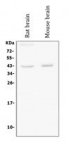 Western blot: 50 µg of sample under reducing conditions. Rat brain and Mouse brain lysates stained with ARG58309 anti-Bmi 1 antibody at 0.5 µg/ml dilution, overnight at 4°C.