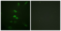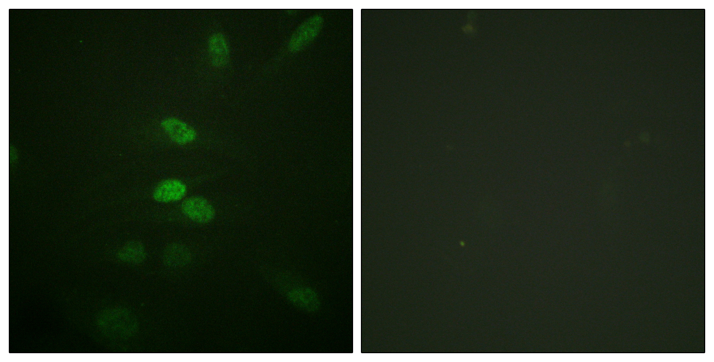 Immunofluorescence: HeLa cells stained with ARG66659 anti-CDC25B antibody. The picture on the right is blocked with the synthetic peptide.