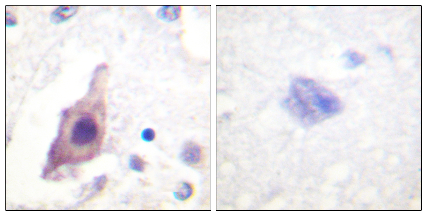Immunohistochemistry: Paraffin-embedded Human brain tissue stained with ARG66659 anti-CDC25B antibody. The picture on the right is blocked with the synthetic peptide.