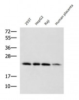 Western blot: 40 µg of 293T, HepG2, Raji and Human placenta lysates stained with ARG66397 anti-CMTM6 antibody at 1:1000 dilution.