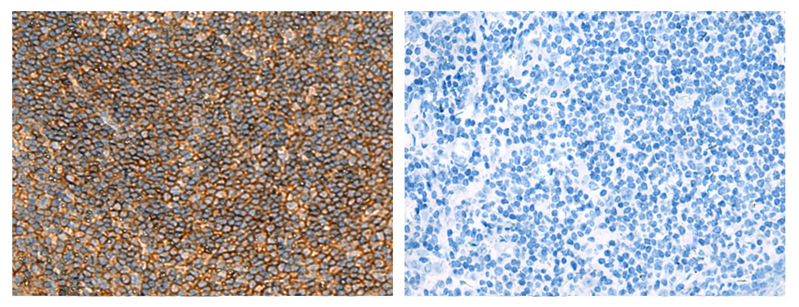 Immunohistochemistry: Paraffin-embedded Human tonsil tissue stained with ARG66397 anti-CMTM6 antibody (left) at 1:40 dilution, or the same antibody pre-incubated with antigen (right). (Original magnification: X200)