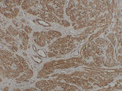 Immunohistochemistry: Paraffin-embedded Human leiomyoma stained with ARG66481 anti-Caldesmon antibody at 1:200 (4°C, overnight). Antigen Retrieval: Tris/EDTA buffer (pH 8.0) was used.