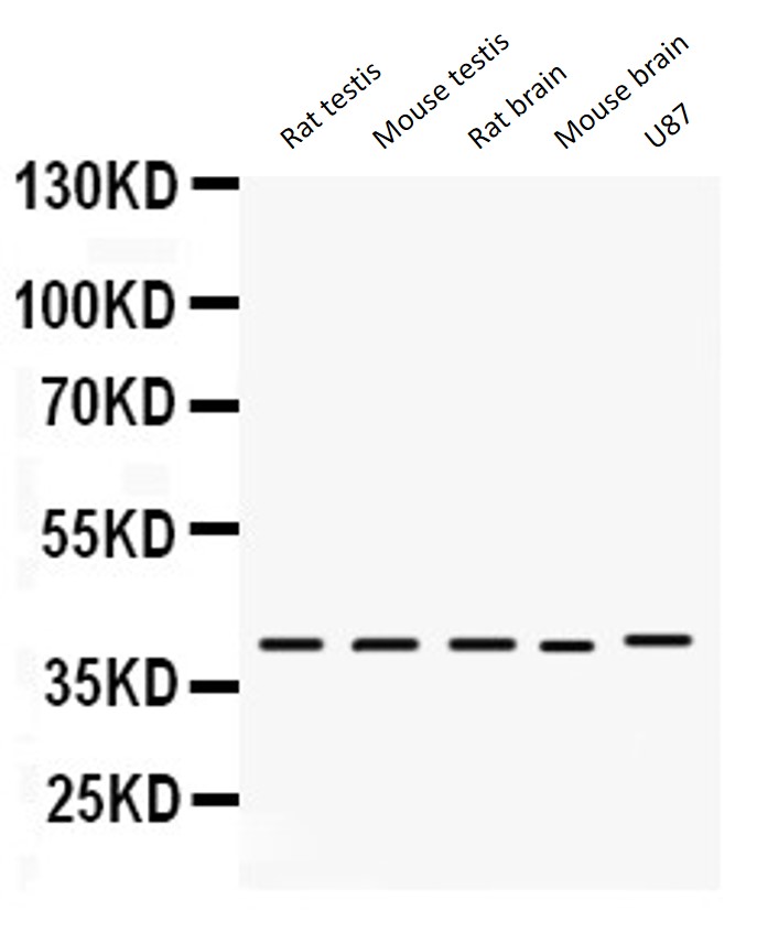 Western blot: 50 µg of Rat testis, 50 µg of Mouse testis, 50 µg of Rat brain, 50 µg of Mouse brain and 40 µg of U87 whole cell lysates stained with ARG58524 anti-DMRT1 antibody at 0.5 µg/ml dilution.