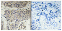 Immunohistochemistry: Paraffin-embedded Human lung cancer tissue stained with ARG66667 anti-Eg 5 phospho (Thr926) antibody at 1:100 dilution, overnight at 4°C. Antigen Retrieval: High-pressure and temperature Tris/EDTA buffer (pH 8.0). Negative control (right): Antibody was pre-absorbed by immunogen peptide.