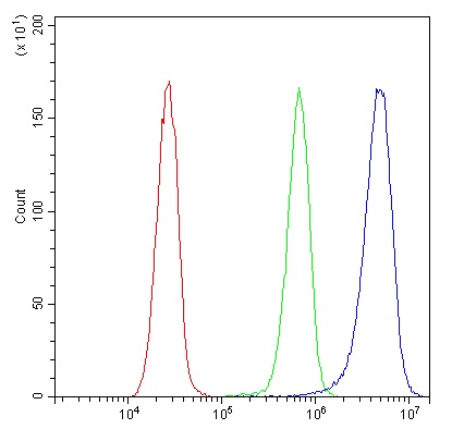 Flow Cytometry: HeLa cells were blocked with 10% normal goat serum and then stained with ARG58780 anti-GSTM1 antibody (blue) at 1 µg/10^6 cells for 30 min at 20°C, followed by incubation with DyLight®488 labelled secondary antibody. Isotype control antibody (green) was rabbit IgG (1 µg/10^6 cells) used under the same conditions. Unlabelled sample (red) was also used as a control.