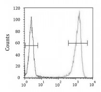 Flow Cytometry: WiDr cells stained with ARG59639 anti-GUSB / beta glucuronidase antibody (right histogram) or without primary antibody as control (left histogram), followed by incubation with FITC labelled secondary antibody.