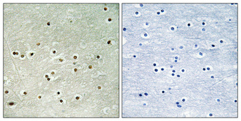 Immunohistochemistry: Paraffin-embedded Human brain tissue stained with ARG66544 anti-MCM4 phospho (Ser54) antibody at 1:100, 4°C and overnight. Antigen Retrieval: High-pressure and temperature Tris-EDTA buffer (pH 8.0). The picture on the right was blocked with the synthetic peptide.