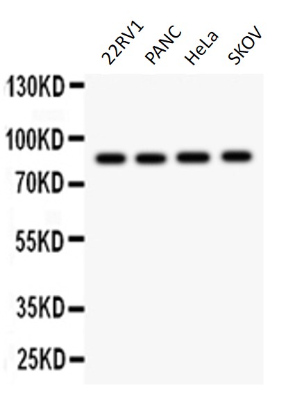 Western blot: 40 µg of 22RV1, PANC, HeLa and SKOV whole cell lysates stained with ARG59888 anti-NOX5 antibody at 0.5 µg/ml dilution.