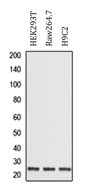 Western blot: HEK293T, Raw264.7 and H9C2 whole cell lysates stained with ARG66557 anti-OAZ1 antibody.
