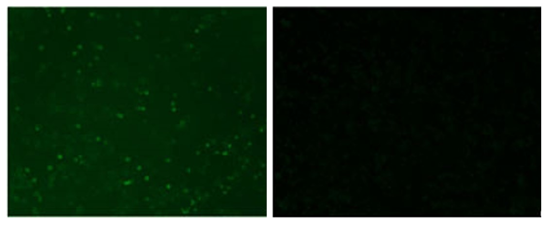 Immunofluorescence: Sf9 cells inoculated with are combinant baculovirus expressing PoRV C (left) and baculovirus (right, negative control), respectively, after being stained with ARG70023 anti-Porcine Rotavirus VP6 (Serogroup C) antibody [11H3].