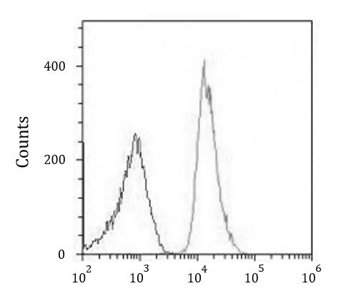 Flow Cytometry: U-2OS cells were fixed with 2% paraformaldehyde (10 min) and then permeabilized with 90% methanol for 10 min. The cells were then incubated in 2% BSA to block non-specific protein-protein interactions and stained with ARG58289 anti-RPL4 antibody (right histogram) at 1:25 dilution for 60 min at 37°C, followed by incubation with DyLight® 488 labelled secondary antibody. Isotype control antibody (left histogram) was Rabbit IgG (1 µg/10^6 cells) used under the same conditions. Acquisition of >10000 events was performed.