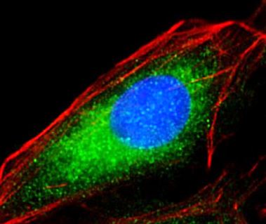 Immunofluorescence: 4% paraformaldehyde-fixed, 0.1% Triton X-100 permeabilized U-2 OS cells stained with ARG58289 anti-RPL4 antibody (green) at 1:25 dilution. Cytoplasmic actin is detected with Dylight® 554 Phalloidin at 1:100 dilution (red). DAPI (blue) for nuclear staining.