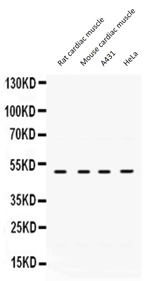 Western blot: 50 µg of Rat cardiac muscle, 50 µg of Mouse cardiac muscle, 40 µg of A431 and 40 µg of HeLa lysates stained with ARG59132 anti-RRM2 antibody at 0.5 µg/ml dilution.