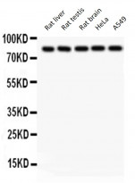 Western blot: 50 µg of Rat liver, Rat testis, Rat brain, 40 µg of HeLa and A549 lysates stained with ARG59127 anti-SOX5 antibody at 0.5 µg/ml dilution.