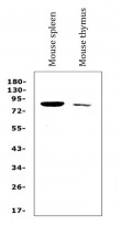 Western blot: 50 µg of sample under reducing conditions. Mouse spleen and Mouse thymus lysates stained with ARG59127 anti-SOX5 antibody at 0.5 µg/ml dilution, overnight at 4°C.