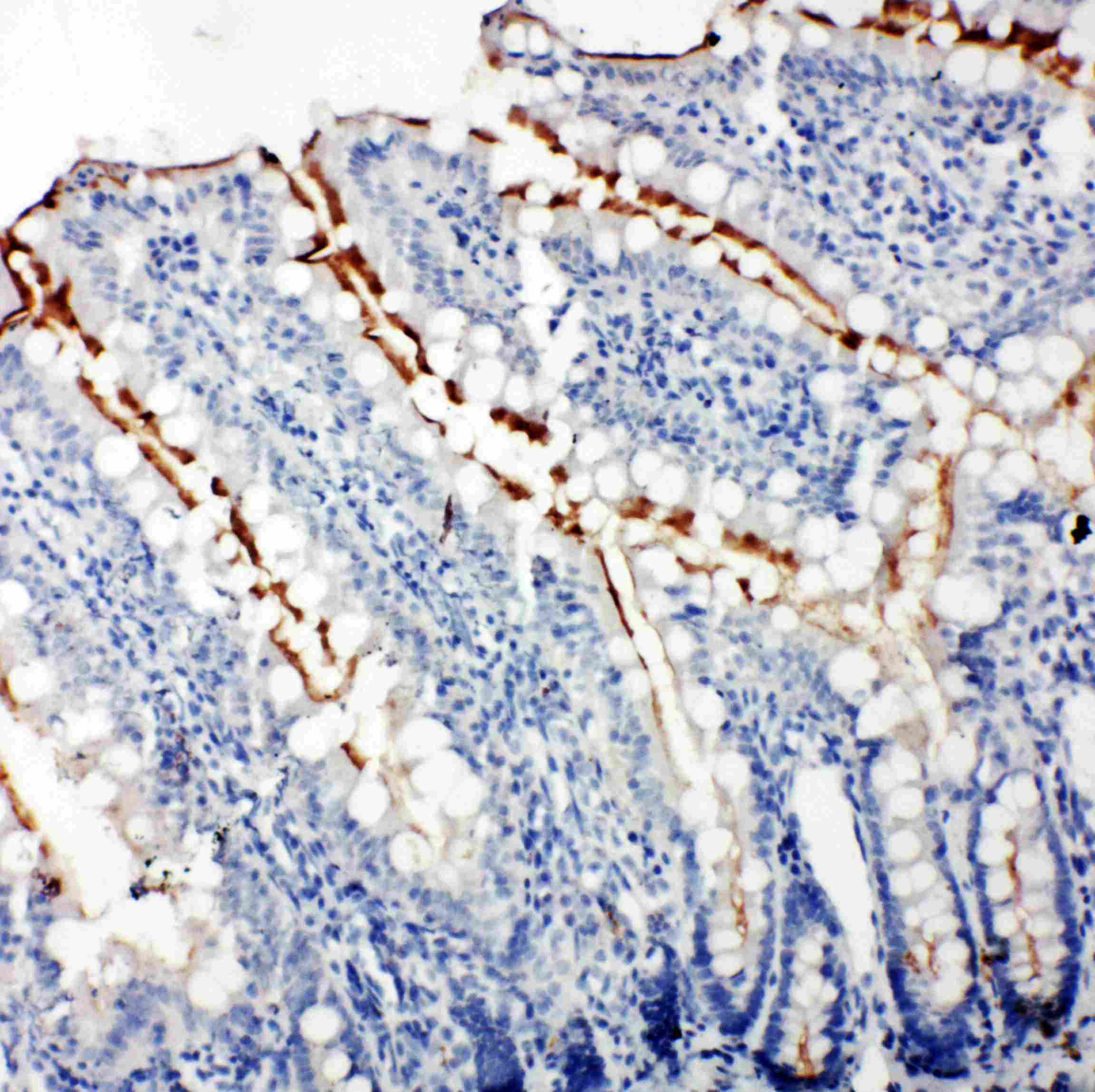 Immunohistochemistry: Paraffin-embedded Rat intestine tissue stained with ARG59889 anti-ZO3 antibody.